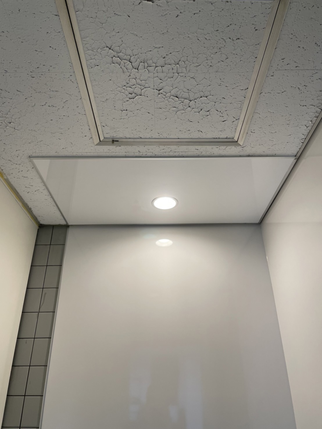 壁と天井も張替えました。天井に照明がなかったので、新たに設置しました。