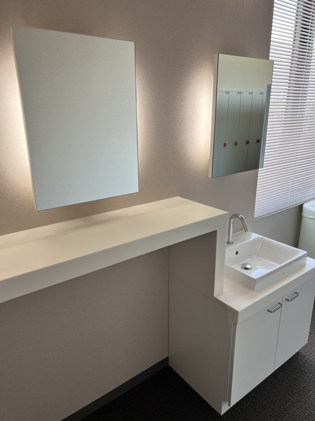健康センターの改修工事に合わせ、女子更衣室も改装しました。オリジナルの棚をつくり、ミラーと洗面台も設置しました。
