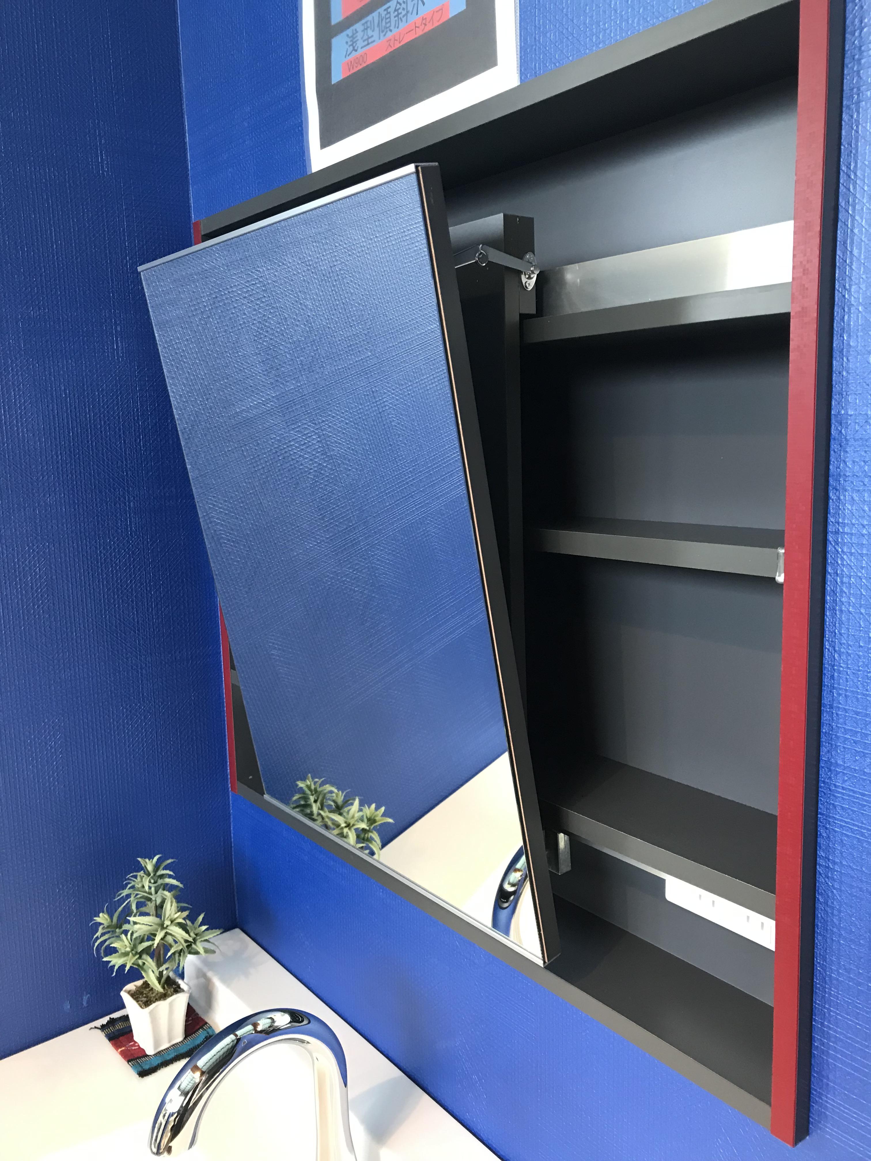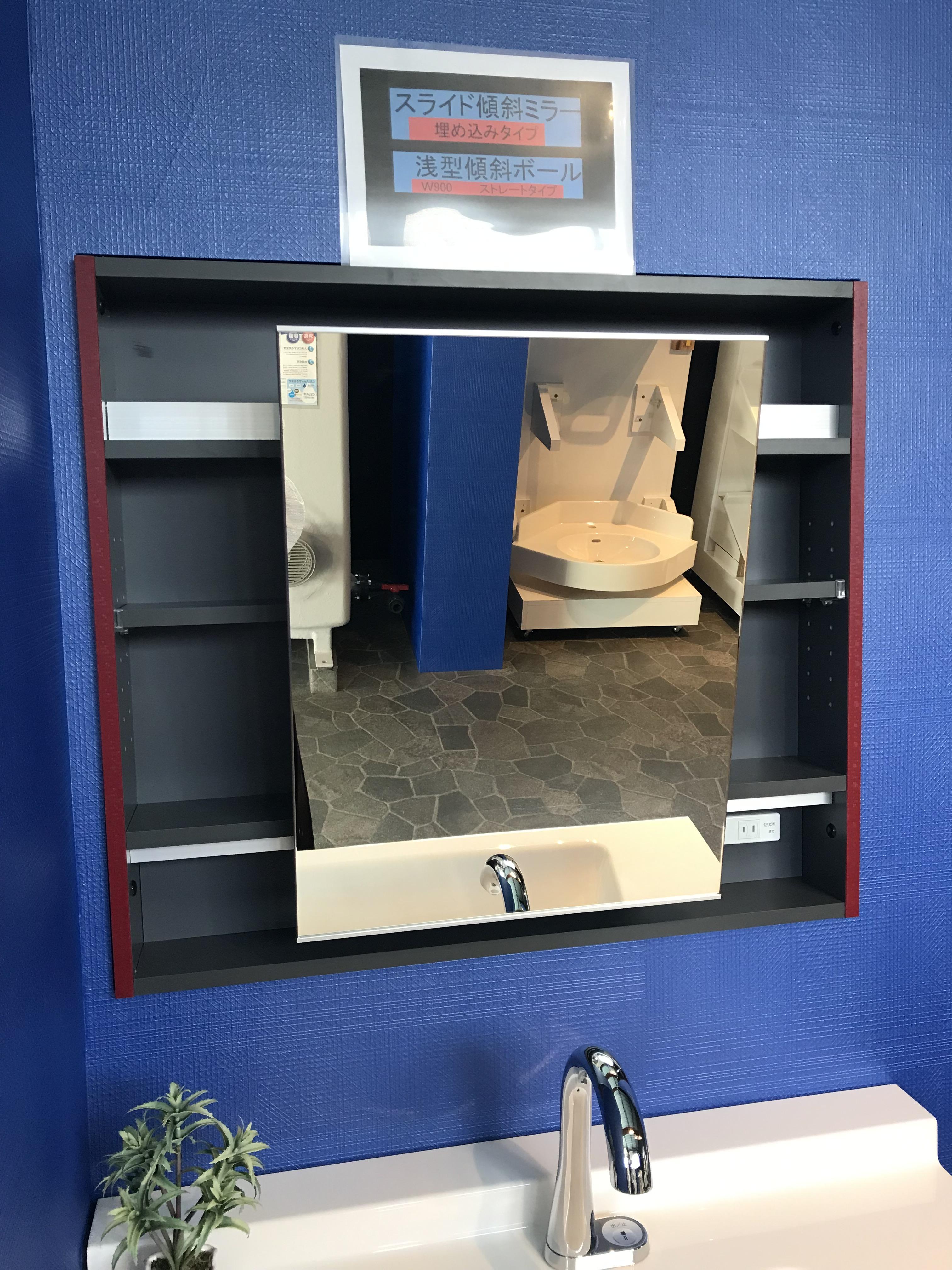 左右にスライドするうえ、傾斜が付けられる便利な鏡です。