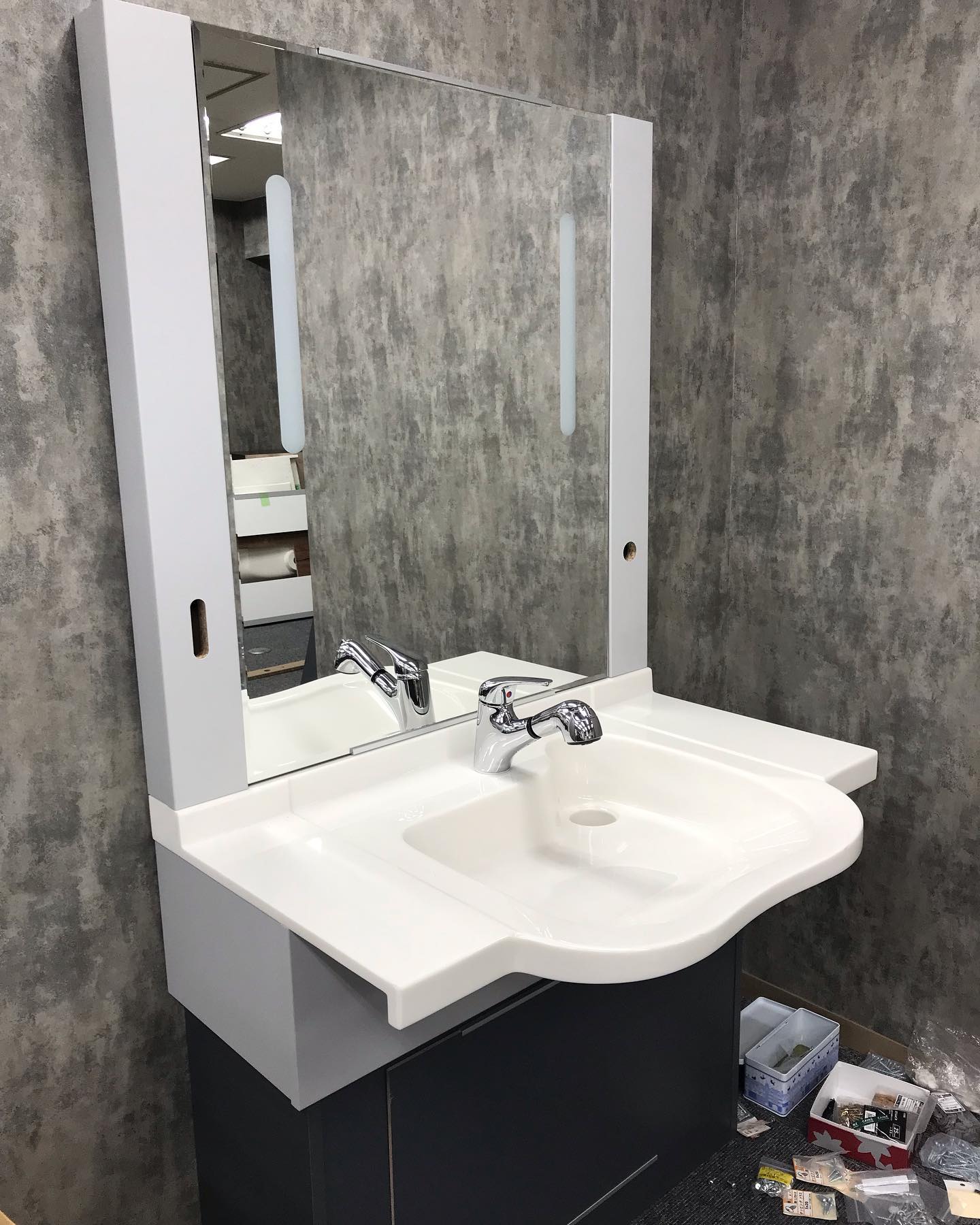 ミラー同時昇降洗面台を東京ショールーム内に設置中!昇降幅は10cm。動画アップまでしばしお待ちを????