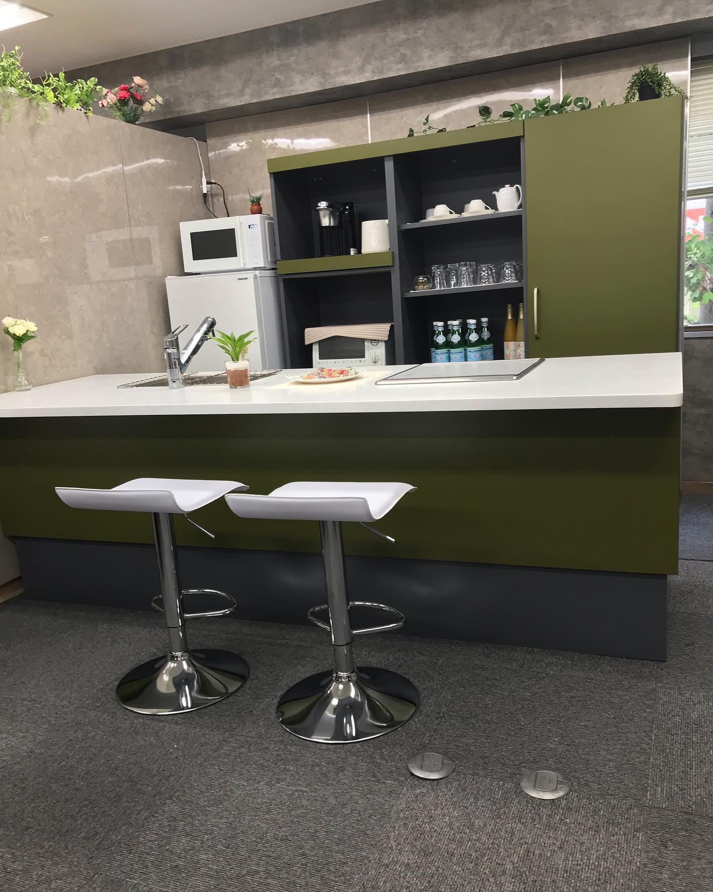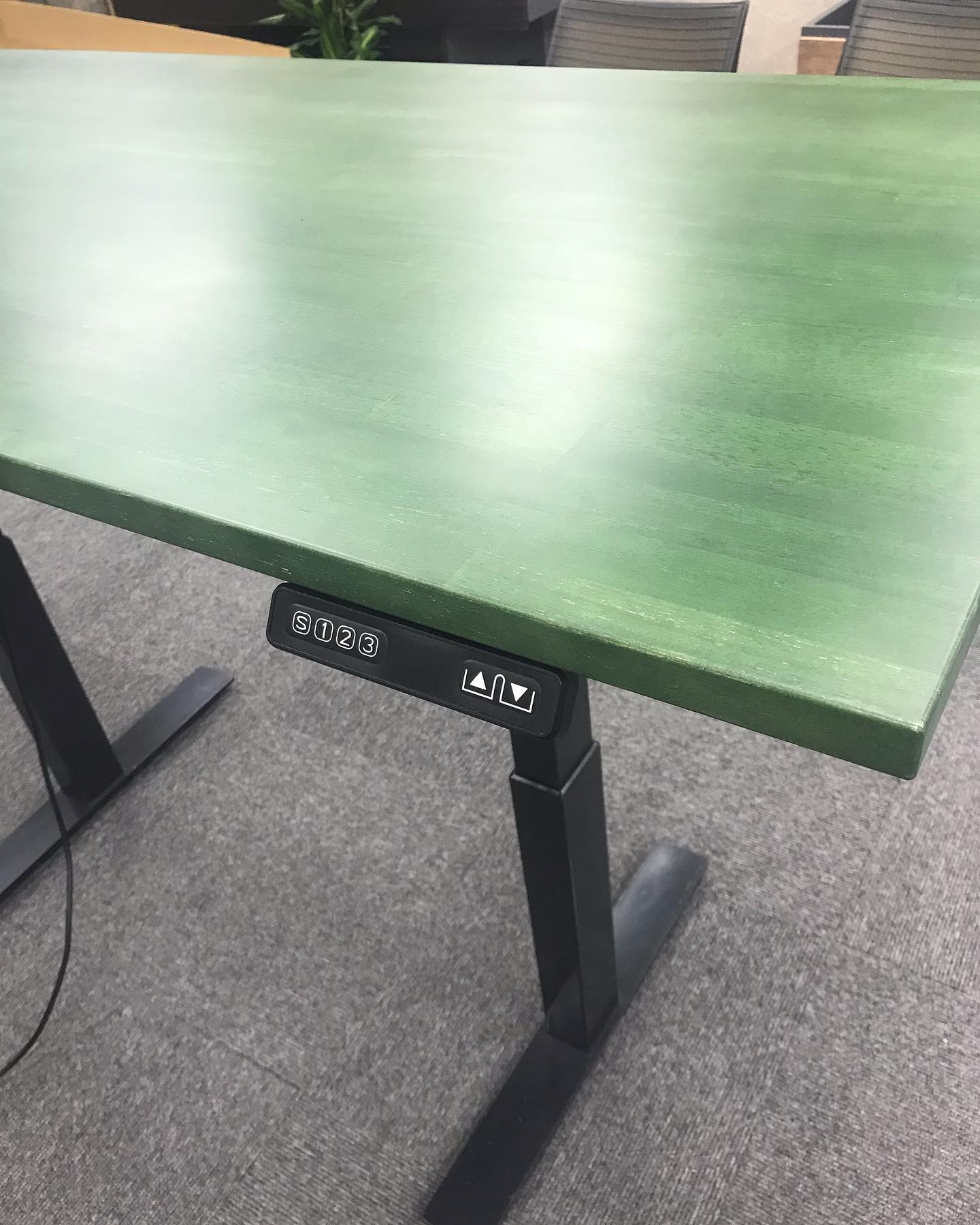 昇降テーブル!!グリーンの天板は無垢の木を使っています!事務所内が明るくなりました!