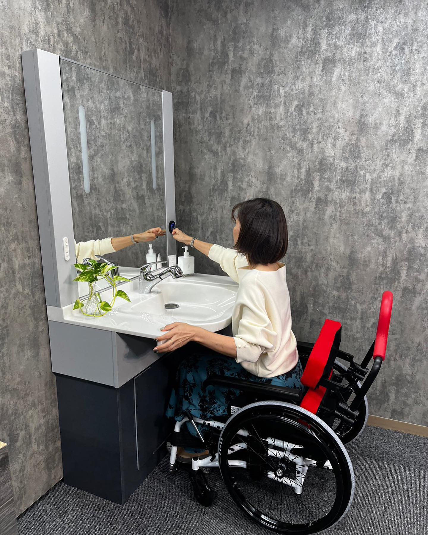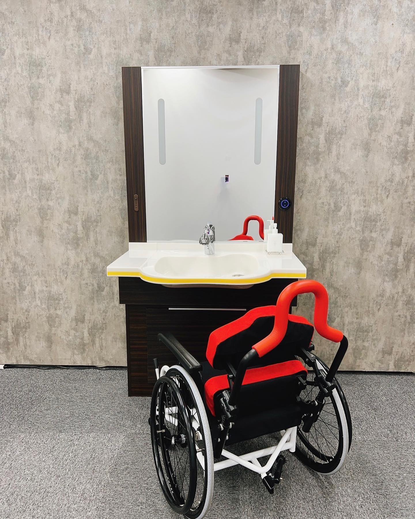 ミラー一体型昇降洗面台は、車椅子に最適です!ミラー内蔵のLEDライトも嬉しい機能????