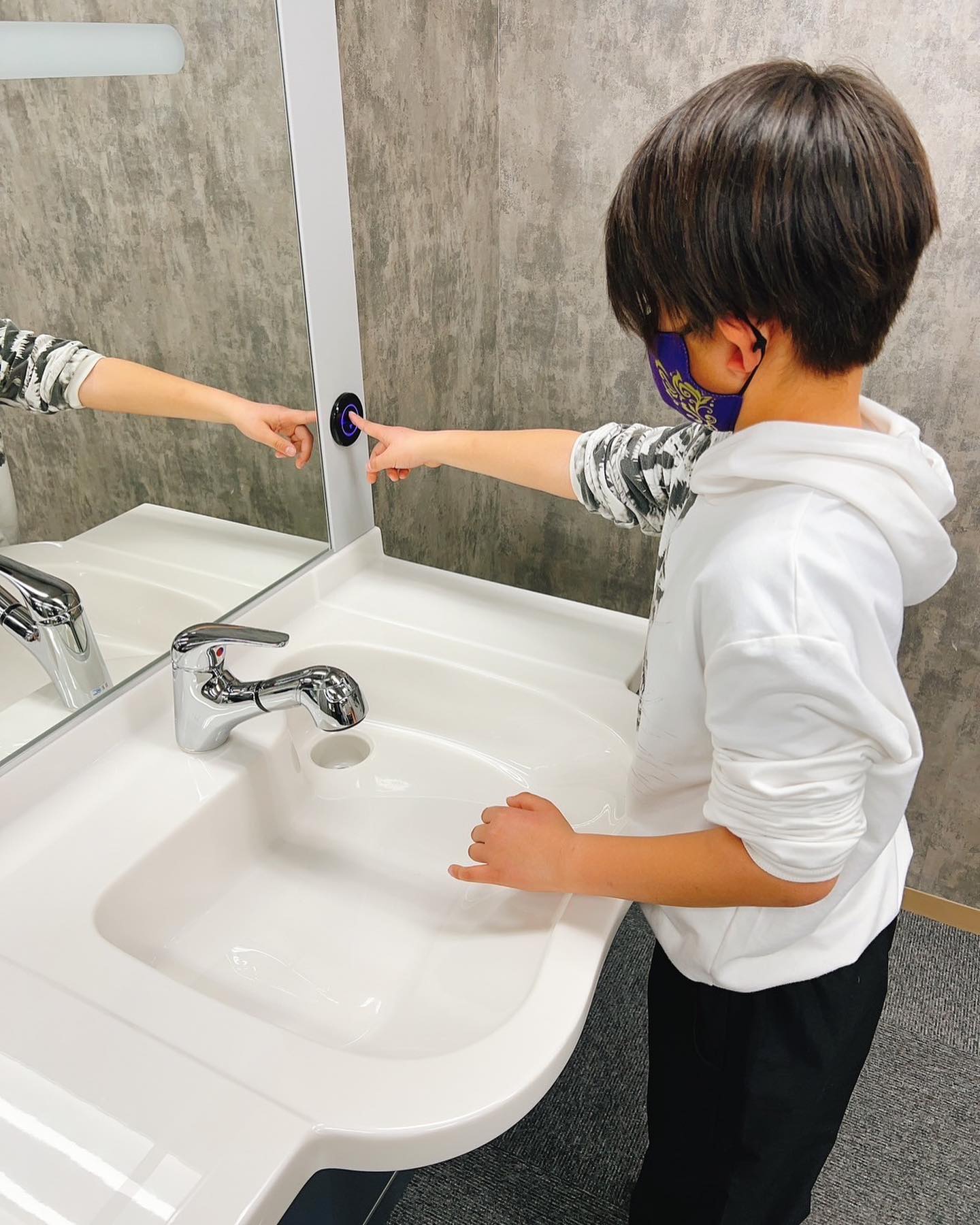 お子さまでも簡単!ボタン操作で昇降します!自分にぴったりの高さで使えるので、衛生的です????