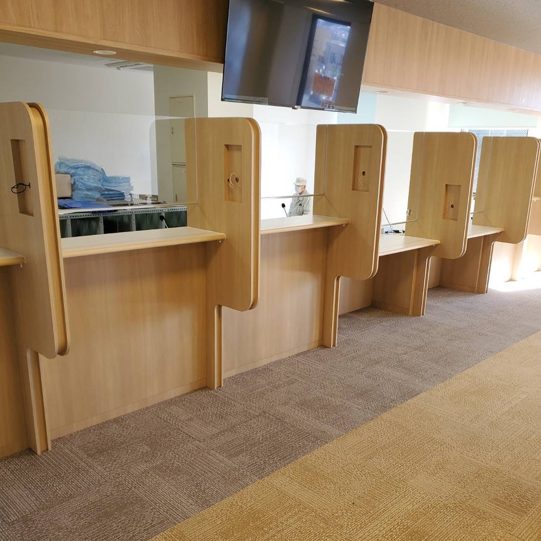診療所の受付カウンターを施工しました。感染症対策として、各仕切りに検温機をはめ込む予定です!
