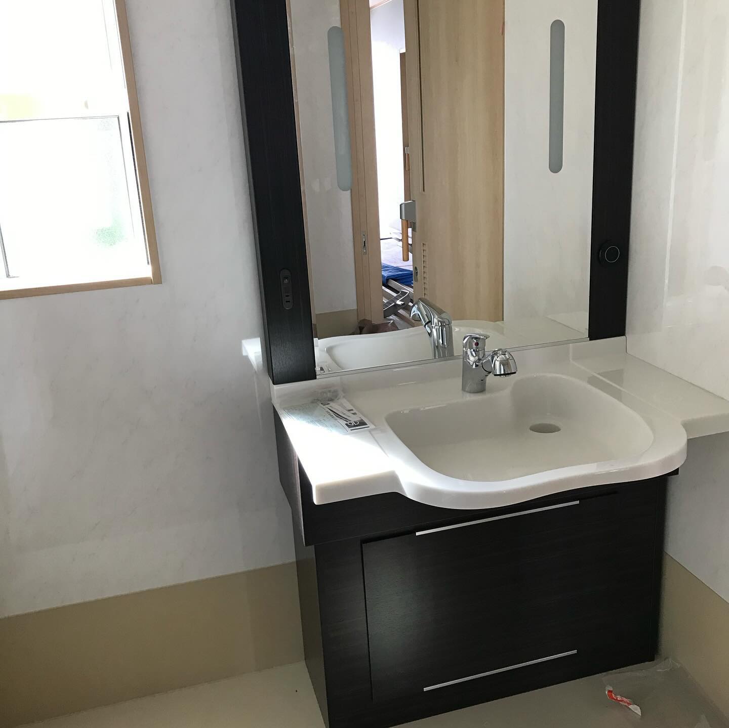 電動昇降洗面台を納品しました????車椅子対応なので足元スッキリ!お客様には、大きいミラーがとっても見やすいと好評でした✨
