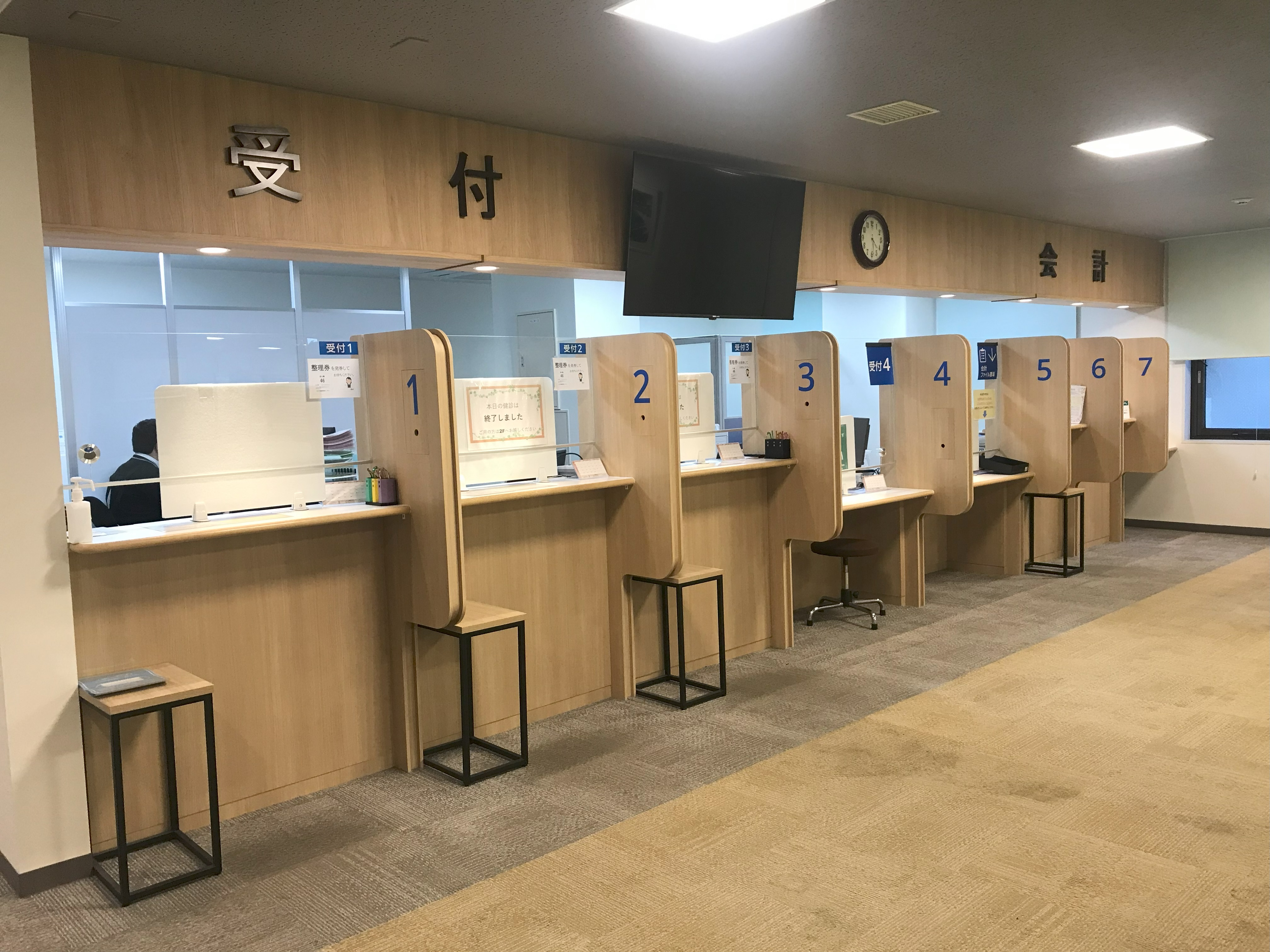 "診療所フロアーリニューアルにあたり、受付カウンターと受付デスクを施工しました。各カウンターの仕切りには、検温器をはめる仕様になっています。
