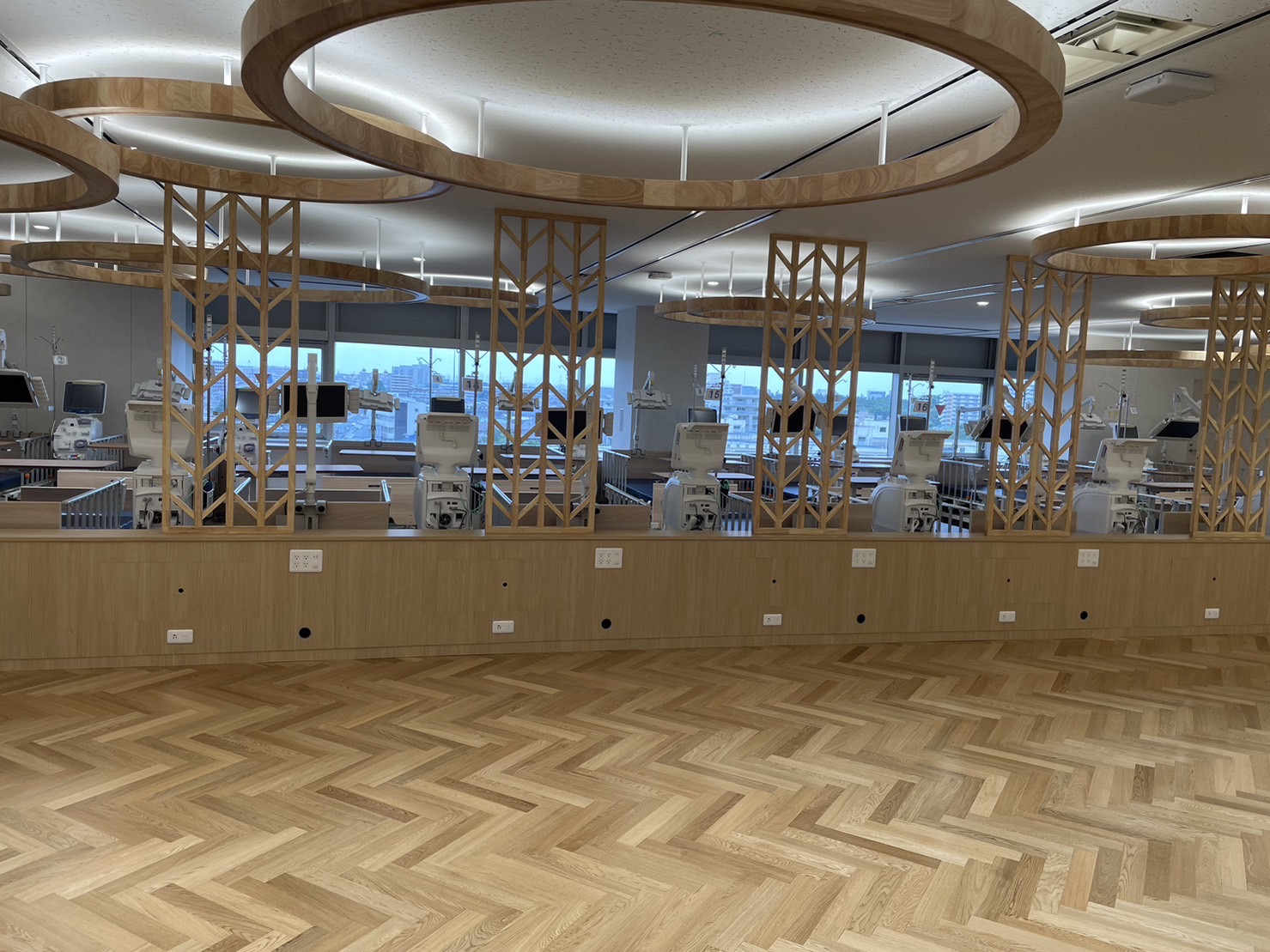 透析病院新築の内装工事全般を請け負いました。取付家具と間接照明は、フローリングの木目調と統一感があり、落ち着いた雰囲気に仕上がりました。