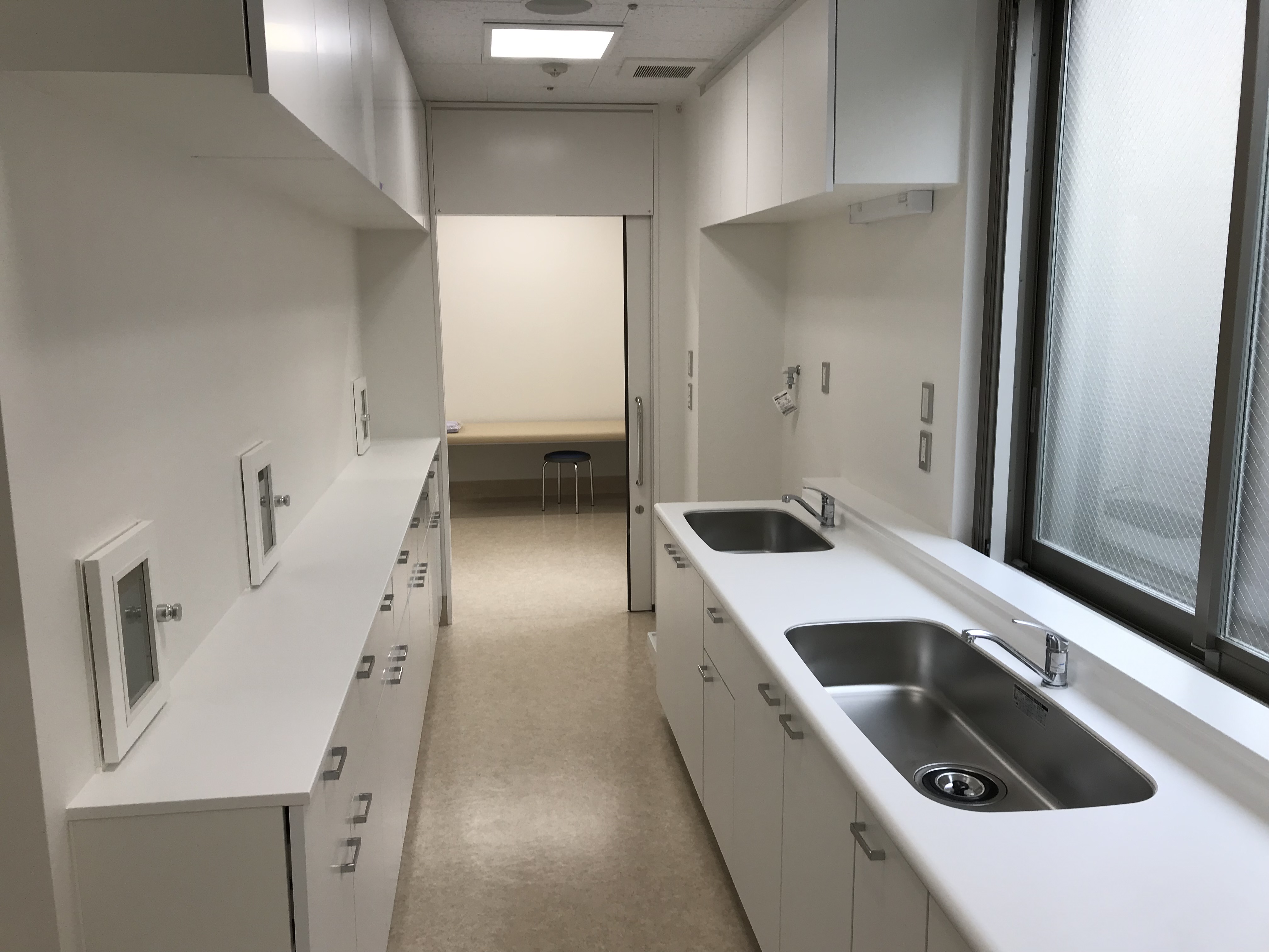病院新築内装工事をしました。受付カウンター・スタッフステーション内の水廻りや吊戸棚、収納をオーダーで作り、設置しました。大容量の収納が確保できました。