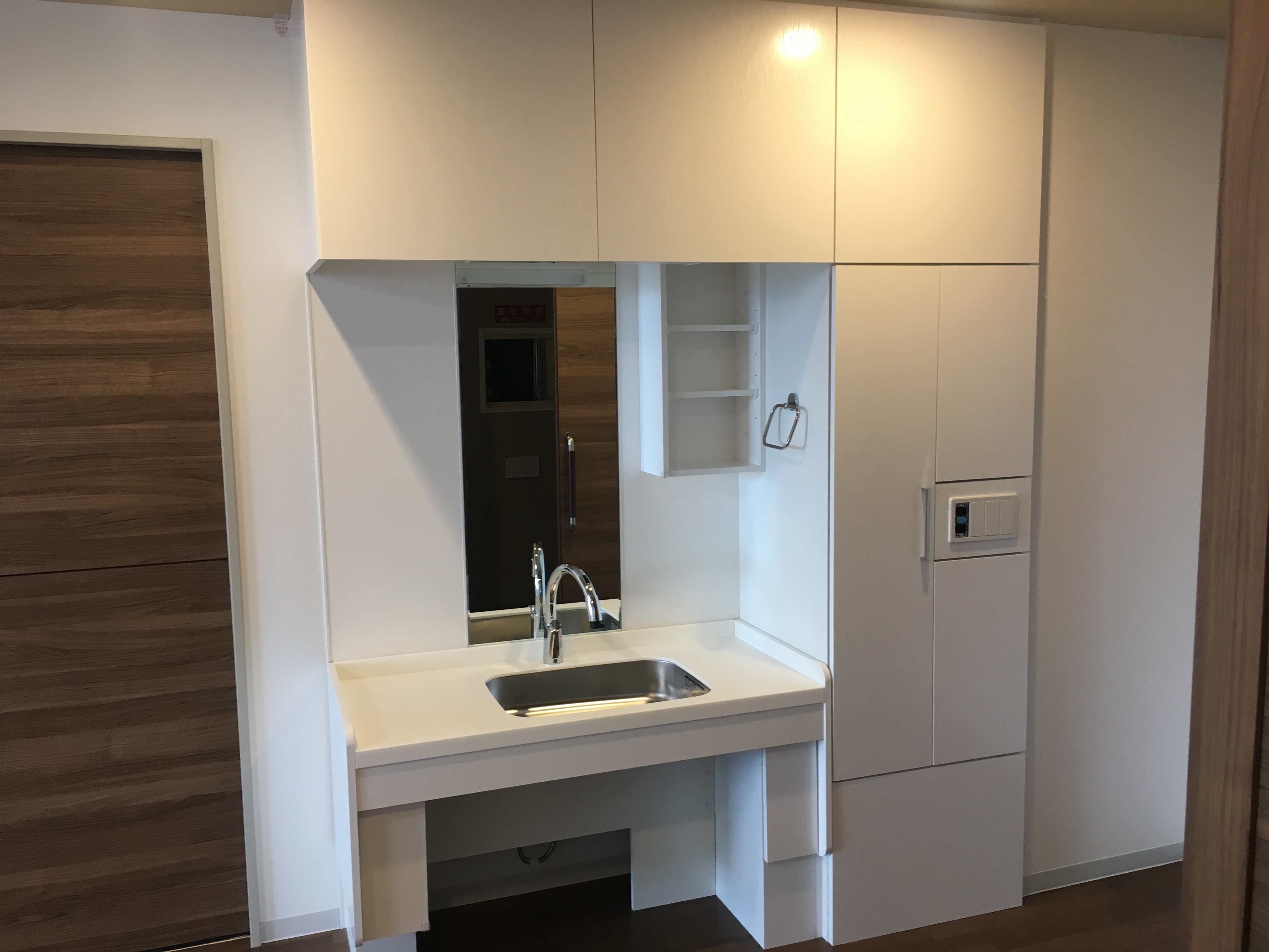 サービス付き高齢者施設の各個室に、電動昇降式洗面台と収納を設置しました。