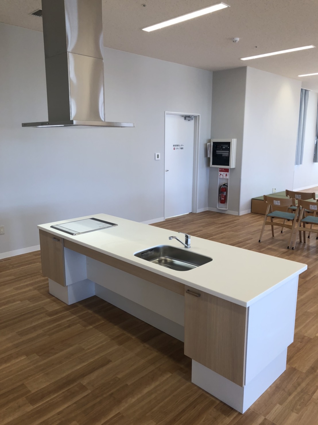 センター内には、みんなの使えるアイランドキッチンを。事務所内には、シンプルなキッチンも設置しました。