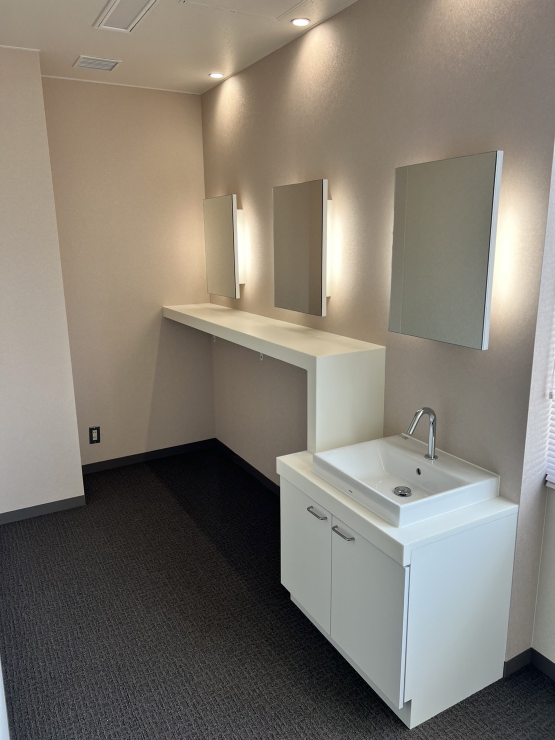 健康センターの改修工事にあたり、女子更衣室も改装しました。オリジナルの棚をつくり、ミラーと洗面台もあわせて設置いたしました。
