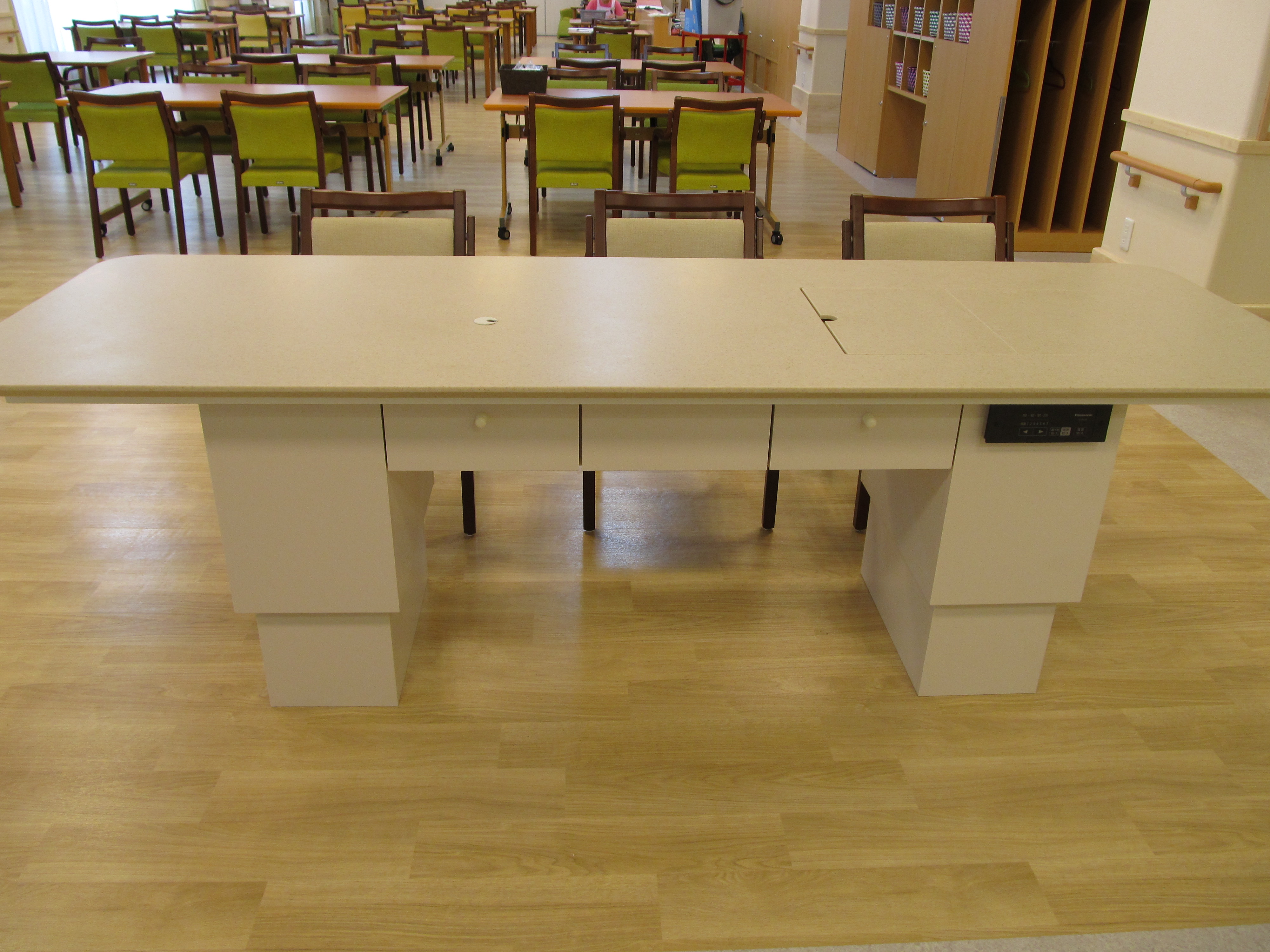 食堂に、電動昇降テーブル(IHヒーター付)を設置しました。操作リモコンは引出しに収納しておけるので、安全です。